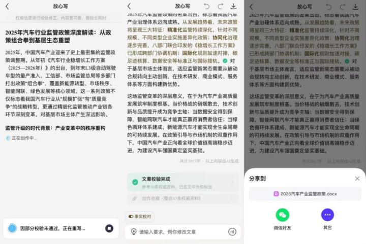 我也试用了一下,拿“最近汽车行业监管战术解读”这个问题生成了一篇著述,具体细节和最终效果我就不伸开说了,只说论断:质地很可用,以对话助手的格式,达到了我以前用某些大模子的智能体的水平。